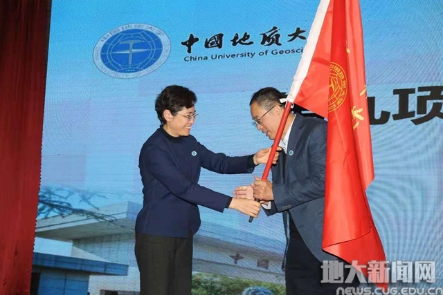 黄晓玫向山东校友分会会长授山东校友会会旗,渠洪喜接旗。