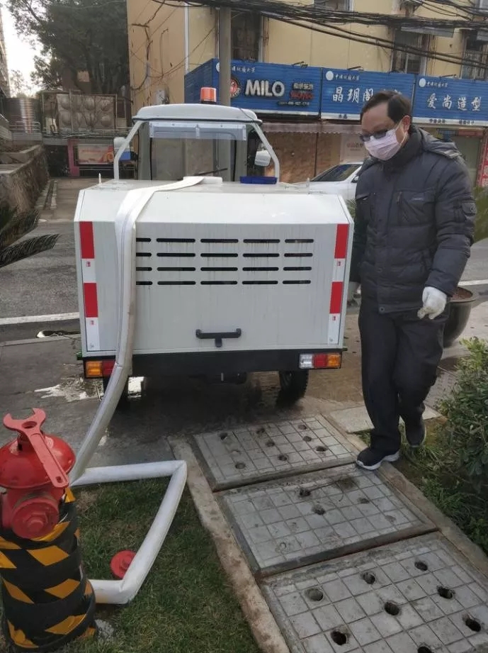 每天,周维雄利用饮食服务中心唯一的一辆洗地车,主动担当起食堂周边环境和中心办公区域的消毒工作。为了能让大家更好地投入到工作环境,他总是比其他人更早投入工作状态,一大早就给洗地车蓄水,仔细冲洗食堂外围的街道,不留一处死角,为减少人员间相互接触,他主动承担起了全部清洗、消毒工作。