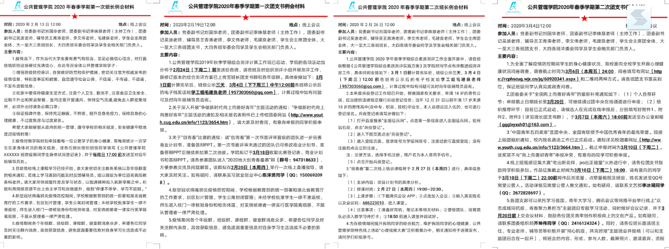 为更有效地开展工作,学院明确分工,实现教育、服务、管理、引导全程覆盖。发展引导实现两个结合,结合纵向年级需求,开展针对性指导;结合横向专业特征,开展特色化引导,守好教育责任田。教育层面守好两个课堂,一方面专业老师保证授课质量,守好第一课堂,同时德育工作组适时开展活动,丰富第二课堂。服务层面落实“两个关心”:关心受疫情影响的贫困学生,及时助力;关心受疫情影响的情绪困惑学生,及时疏导。做好后勤保障,隔空送温暖,千里仍温馨。日常管理做到“两个覆盖”:持续开展线上主席团例会、班团例会、主题党团会,及时传达最新要求,确保通知信息各班级、各同学全覆盖。