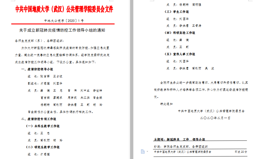 地大新闻网(记者张玉贤 通讯员李姝慧 刘国华)自学校启动疫情防控工作以来,公共管理学院加强应急处置力量,建立统一完善的应急处置指挥协调体系,压实管理责任,做好分工协调,成立了以党委书记和院长为组长,全体班子成员、工会主席和各系书记、主任及骨干教师为成员的领导小组,组成了以副书记和全体辅导员为成员的学生工作组,以副院长和教务科老师为成员的本科生教学工作组、研究生教学工作组、科研实验工作组,以副书记和院直相关成员组成的宣传人事工作组,实现育人全方位,有序平稳推进疫时教学服务工作,确保“停课不停教,停课不停学”,筑牢学院安全防护网,齐心协力打好这场防控硬仗。