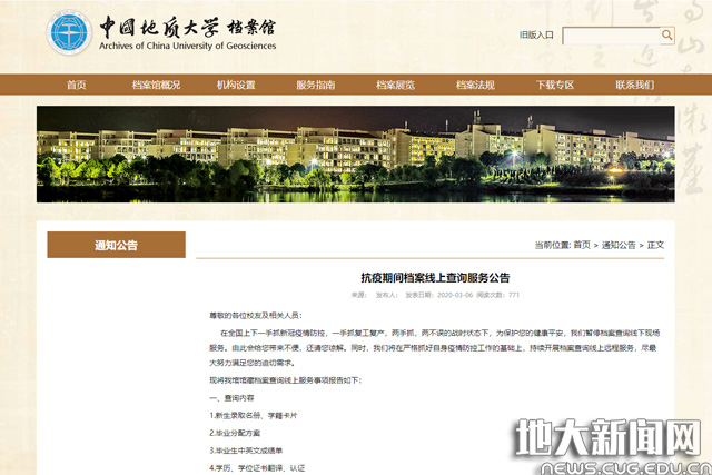 地大新闻网(通讯员张浩 刘欣)新冠病毒肺炎疫情发生以来,档案馆高度重视疫情防控工作,提高政治站位,切实把思想和行动统一到习近平总书记重要指示精神和党中央、国务院部署上来,贯彻落实教育部“停课不停教、停课不停学”的决策部署,按照学校党委疫情防控的总体部署,坚守抗疫一线,创新探索线上档案服务,启动抗疫档案征集工作,记录战“疫”实况,强化地大担当。