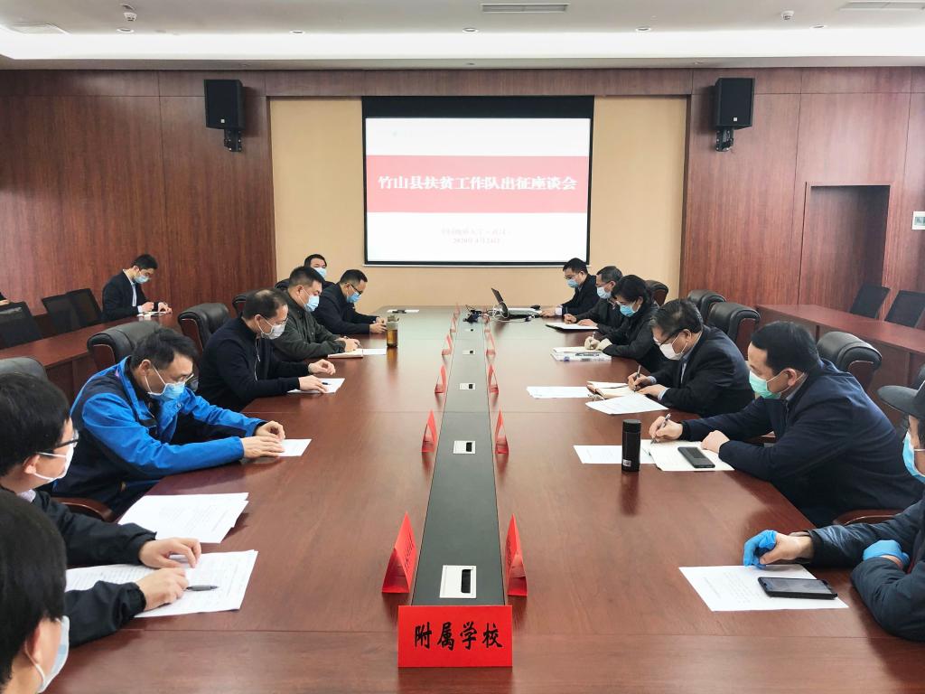 珠宝学院院长杨明星、后勤保障处处长王文起、工会常务副主席喻芒清、附属学校党总支部书记彭冠军等,就贯彻落实学校党委要求,落地落实落细2020年对口竹山帮扶任务进行发言。