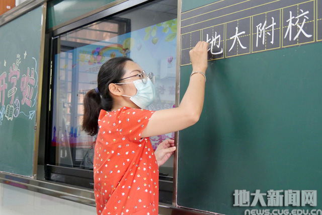 老师带领学生书写“地大附校”四个大字,开启对学校的认知。学生一笔一画,认真写下人生第一笔。