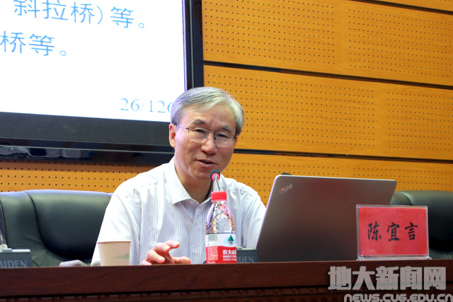 随后,陈宜言教授作客工程文化论坛,为师生作了题为《中国桥梁创新发展之路》的学术报告。他从中国桥梁发展历程、城市桥梁美学赏析、波形钢腹板梁桥发展与创新、SPMT快速拆架桥技术等方面,为师生讲解了我国桥梁发展历史及前沿科学研究,并与师生开展交流互动。