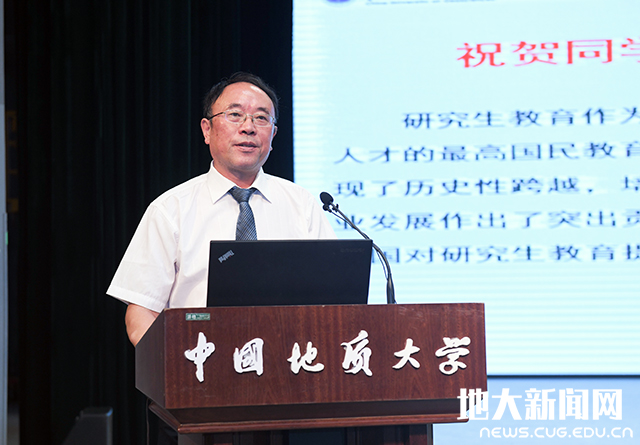 研究生导师代表、资源学院沈传波教授发言。他说,未来几年,广大研究生将成为学校不可或缺的重要科研力量,成为与老师们合作的研究者。广大研究生要勤于思考、敢于创新,团结合作、逐梦远方,在未来的日子里乘风破浪,勇往直前,用执着与拼搏书写人生新篇章。