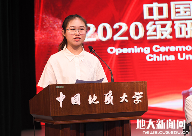 研究生新生代表、公共管理学院2020级公共管理专业硕士研究生王欣雨发言,她分享了自己的支教经历,并表示,将在投身强国伟业中实现人生价值、在“严在地大”学习氛围中聚焦明天,在学思践悟中不断突破自我、提升价值,在赶考路上成为一名优秀的答卷人。