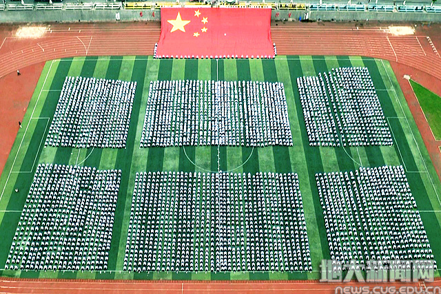 由各学院新生组成的千人方阵,分别进行擒敌拳和团体操表演,他们动作整齐划一,口号嘹亮,“艰苦朴素、求真务实”校训响彻上空,尽显新生们昂扬的青春风貌。
