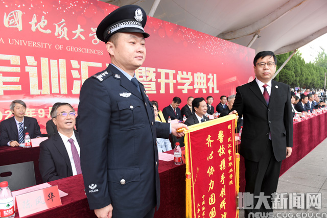 校党委副书记唐辉明向军训承训单位武汉警官职业学院赠送锦旗。