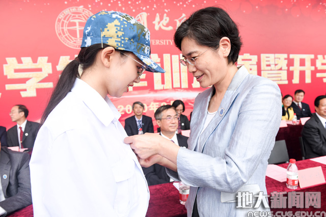 校党委书记黄晓玫为新生代表佩戴校徽。