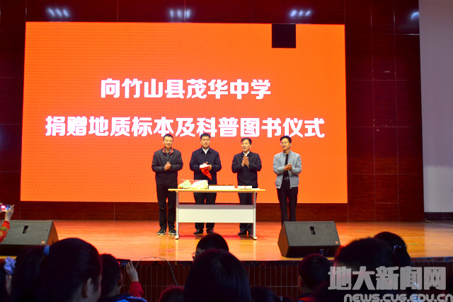 科普讲座期间,逸夫博物馆馆长刘先国代表逸夫博物馆,将42种矿物岩石标本和科普图书捐赠给茂华中学,丰富了该校科普馆藏。该校校长师光武接受捐赠。竹山县副县长李杰,教育局局长毛光卫参加捐赠仪式。