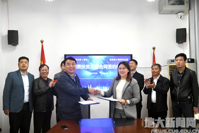 会谈结束后,后勤保障处处长王文起与竹山县消费扶贫专线对接负责人吴云签下专柜采购第一单:学校采购竹山县20万元长粒米。