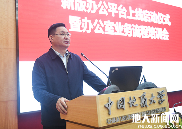 副校长刘杰宣布新版办公平台正式上线启动。他表示,在学校开展“十三五”总结、“十四五”规划之际,新版办公平台正式启动,是治理能力提升年的重要工作成果,是推动跨校区信息互通、资源共享的有力抓手,是面向未来、以管理信息化带动治理能力现代化的创新探索,标志着学校信息化工作又向前跨出了一大步。他指出,新版办公平台启动只是开端,各单位要有全校“一盘棋”的意识,要有上下“一条心”的自觉,要有拧成“一股绳”的干劲,让“信息多跑路、师生少跑腿”,不断提高行政办公效率,不断提升学校管理服务水平,为建成地球科学领域国际知名研究型大学阶段性办学目标而努力奋斗。