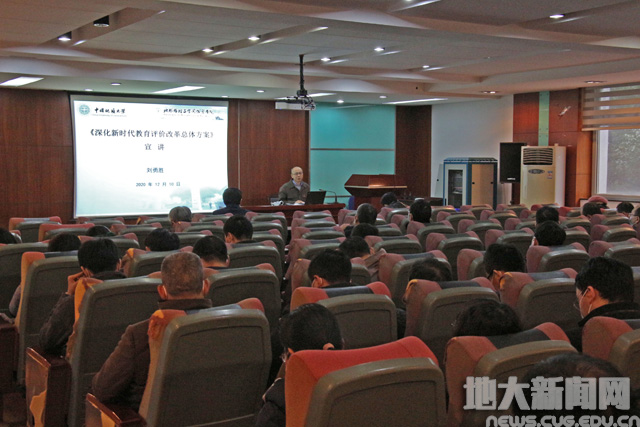 地大新闻网讯(通讯员祁阳阳)12月10日,校党委常委、副校长刘勇胜在物探楼报告厅为地空学院教职工讲授专题党课,就《深化新时代教育评价改革总体方案》(以下简称《总体方案》)进行宣讲。会议由地空学院党委书记刘子忠主持。