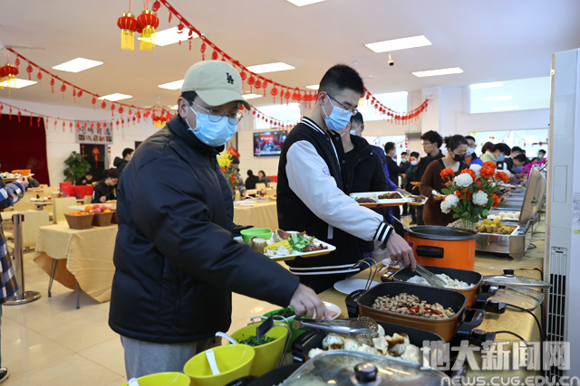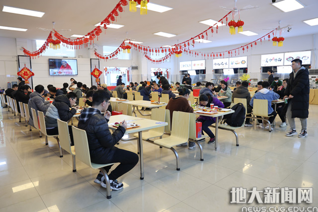 地大新闻网讯(记者王俊芳)子鼠送福盈日月,丑牛迎喜满乾坤。2月11日除夕,南望山校区西区学生三食堂、东苑食堂张灯结彩,处处洋溢着新春的喜庆气氛,学校为留校的98名本科生、研究生,255名国际留学生准备了丰盛的年夜饭,共迎佳节。