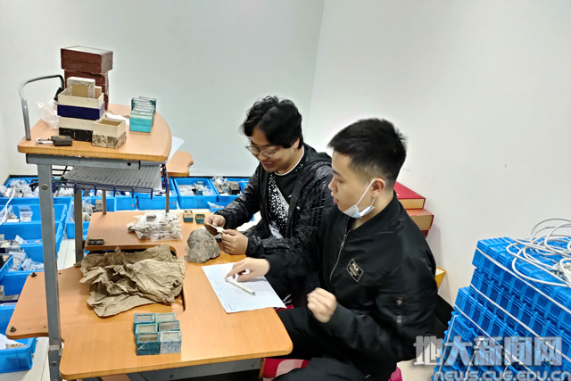 全国大学生年度人物、地学院2020级博士生王奉宇(左)在博物馆整理张研捐赠的标本
