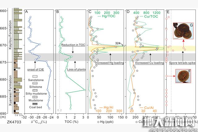 在如此高二氧化碳浓度的背景下,位于低纬度的华南陆地生态系统遭到了重创,发生了一系列环境恶化事件。研究团队的前期工作发现伴随着碳同位素开始负偏,代表晚二叠世热带雨林生态系统的聚煤植物大羽羊齿植物群遭受灭绝,同时地层中的木炭丰度剧烈升高,反映了黔西滇东地区的野火强度和频率的显著提高,可能是高二氧化碳浓度驱动的高温和强烈的季节性气候导致的。在陆地生态系崩溃之后,黔西滇东地区的植物面貌发生了重大转变,大羽羊齿植物群被多样性十分单一的石松类所取代。研究团队的另一项工作发现,这些残存的石松类孢子在重金属含量富集的层位出现了畸变现象,石松类孢子四分体的比例显著提高,甚至可达到孢子总数的19%,这大大超过了自然界中正常情况下的孢子四分体含量。这种耦合关系反映了石松类孢子的异常可能是高重金属含量对植物的毒化造成的。该成果已于2月5日在《地质学》上在线发表。文章的第一作者和通讯作者为米兰地球科学学院和生物地质与环境地质国家重点实验室楚道亮博士。