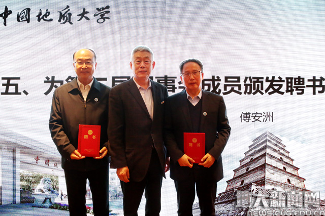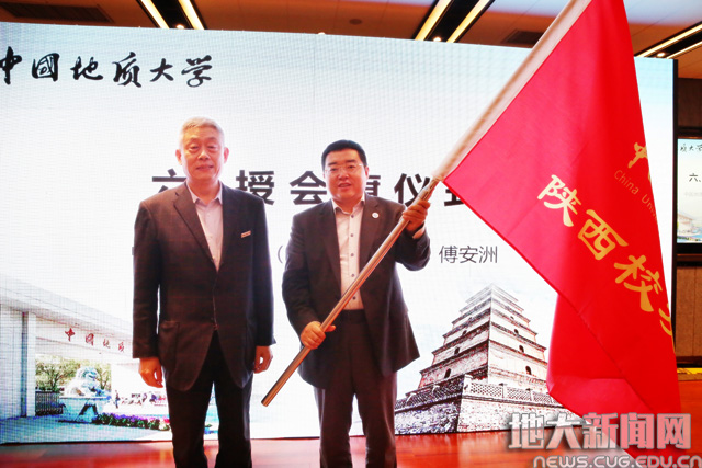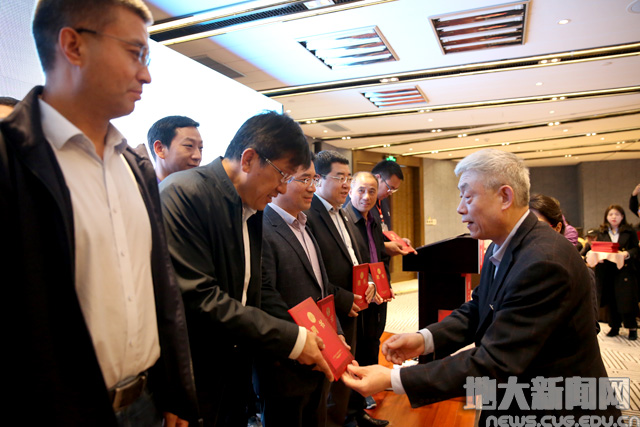 傅安洲为彭建兵、李志忠颁发名誉会长证书,为陕西校友会第二届理事会颁发聘书,并向陕西校友会授会旗。