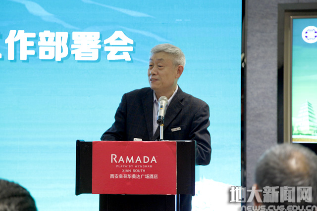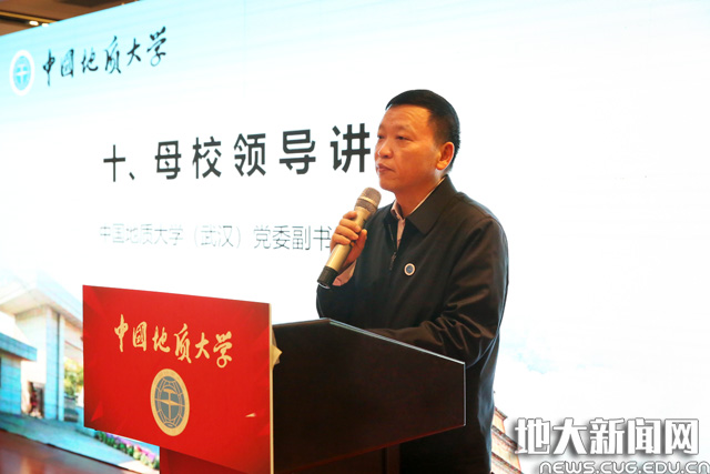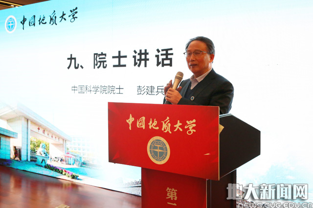 彭建兵院士讲话。他回忆了40多年前,在母校读书和野外地质实习期间,马宗晋等院士和老师授课的情景,表示母校的学识基因对他的一生影响深远。他认为陕西具备三个典型的地质地貌带,为地质工作者提供了丰富的研究条件,希望陕西校友们扎根黄土大地,为陕西建设奉献力量,为母校赢得荣誉。