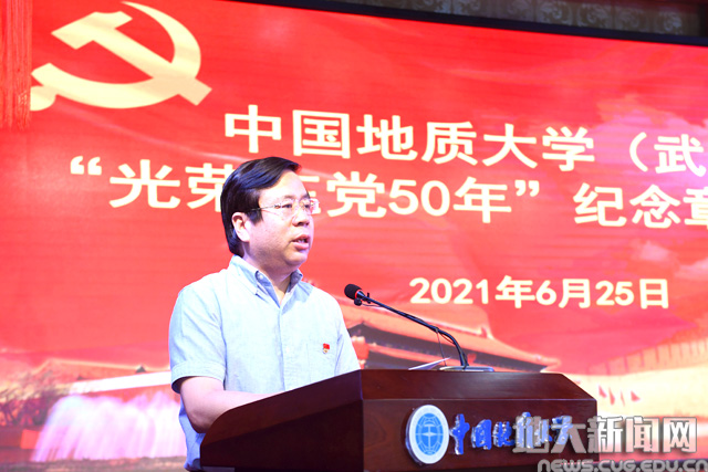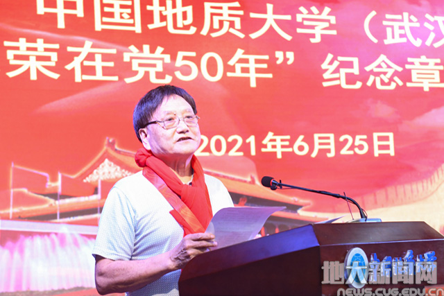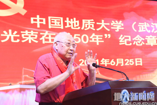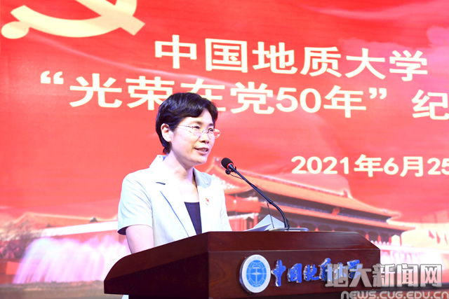 黄晓玫代表学校党委向获得“光荣在党50年”纪念章的老党员表示热烈祝贺和崇高敬意。她说,建校近70年,南迁办学50余载,学校取得的每一项成绩都倾注了老党员们的智慧心血,学校不会忘记大家为党、为国家、为学校建设和发展做出的卓越贡献。当前学校正处在“三步走”发展战略第二阶段,向着建设“地球科学领域国际知名研究型大学”的目标努力奋斗,她真诚希望老党员们能够继续发挥聪明才智,关心支持学校事业发展,积极为学校改革献计献策、加油鼓劲,在全校范围内形成关心、支持、参与、推动改革发展的强大合力。她提出,全校上下特别是离退休干部党委要在党史学习教育中进一步落实“办实事”的要求,切实解决大家“急、难、愁、盼”的问题,让老同志过得安心、静心、舒心、暖心,引导老同志们充分利用自身优势,发挥示范传承作用,把作为见证者、参与者的地大奋斗历程分享好,一如既往讲述好党的故事、传播好地大好声音,感染带动更多年轻党员积极投身伟大事业,让地大红色基因在“传帮带”中持续发扬光大。全体师生要以老党员们为标杆和榜样,传承他们的光荣传统和优良作风,坚定理想信念,努力建设地球科学领域国际知名研究型大学,以新的更大的成绩迎接中国共产党成立100周年。