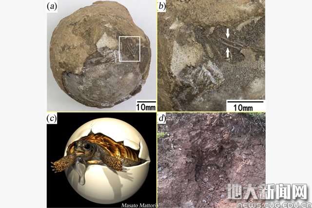 (a)龟胚胎蛋化石CUGW EH051照片;(b)蛋化石局部放大图,白色箭头指示暴露出来的胚胎骨骼;(c)孵化中的南阳豫龟(想象图);(d)化石CUGW EH051产出的地层