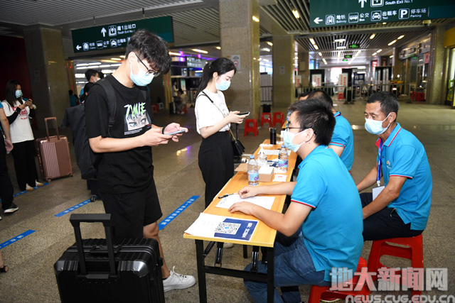 为了迎接新生们的到来,身着地大蓝的192名教师党员组成的志愿者队伍和学生志愿者,早早来到武汉三大火车站,为新生们提供接站服务,消毒、引导,一切井然有序,志愿者们准备了座椅和矿泉水,供家长和新生休息、等候,他们亲切的笑脸和贴心的服务洗刷了家长和新生们的满身疲惫。