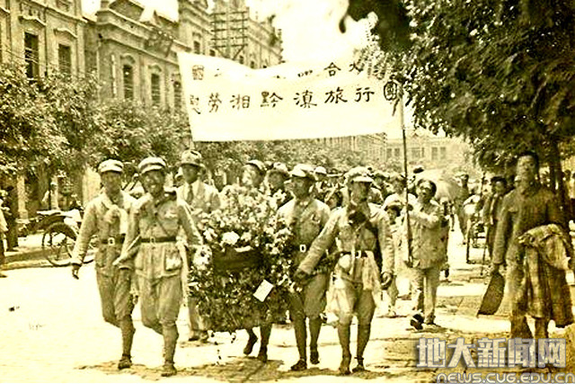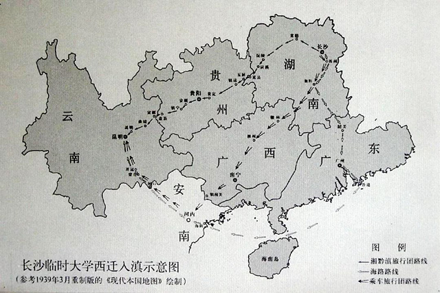 长沙临时大学分海、陆两路从三条路线前往昆明。其中一路由自愿步行入滇的师生组成“湘黔滇旅行团”。他们从长沙出发,以徒步行军的方式开始了向昆明奔赴的“长征”,以此向全世界昭告中国教育界的“抗日宣言”。
