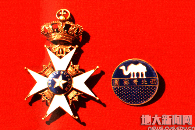 瑞典皇家科学院授予袁复礼的北极星奖章(左),西北科学考察团团徽(右)