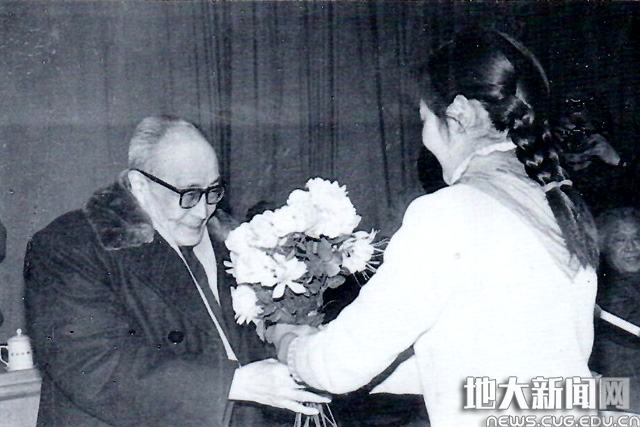 在庆祝中国地质学会成立60周年大会上,少先队员将鲜花献给创立会员袁复礼教授(1982年)