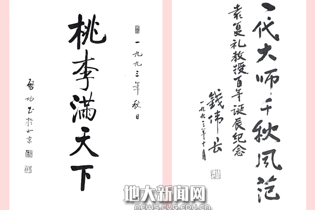 袁复礼百年诞辰纪念启功教授题写书名“桃李满天下”(左),钱伟长教授题词“一代大师 千秋风范”(右)