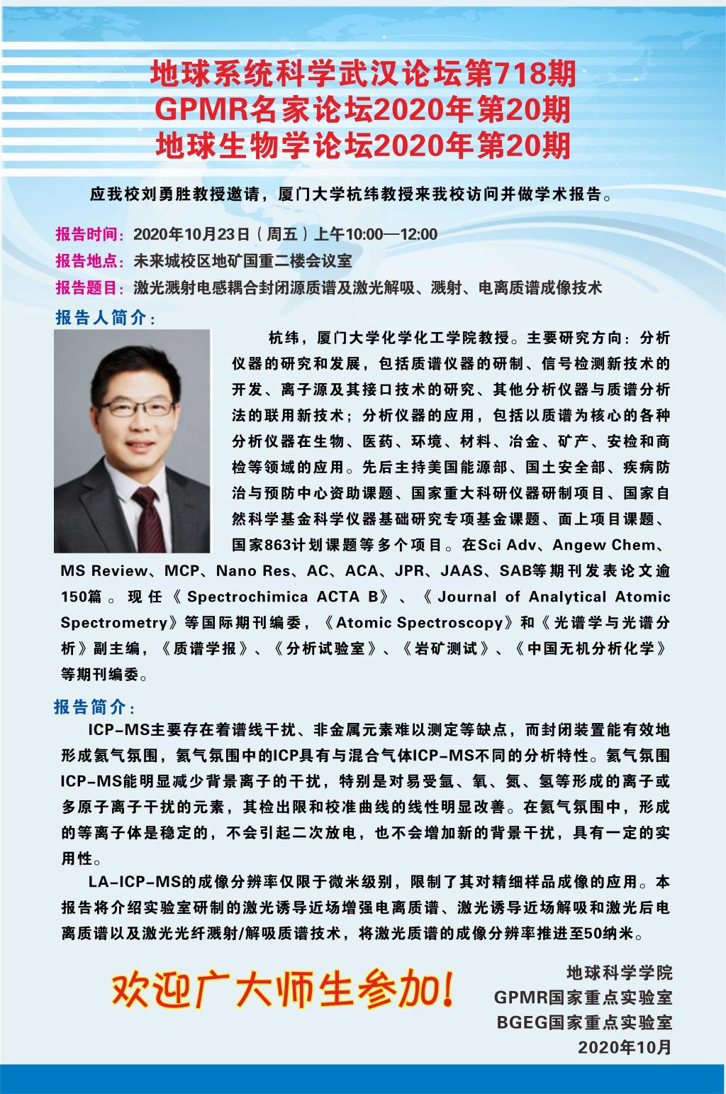 【10月23日】地球系统科学武汉论坛:激光溅射电感耦合封闭源质谱及激光解吸、溅射、电离质谱成像技术