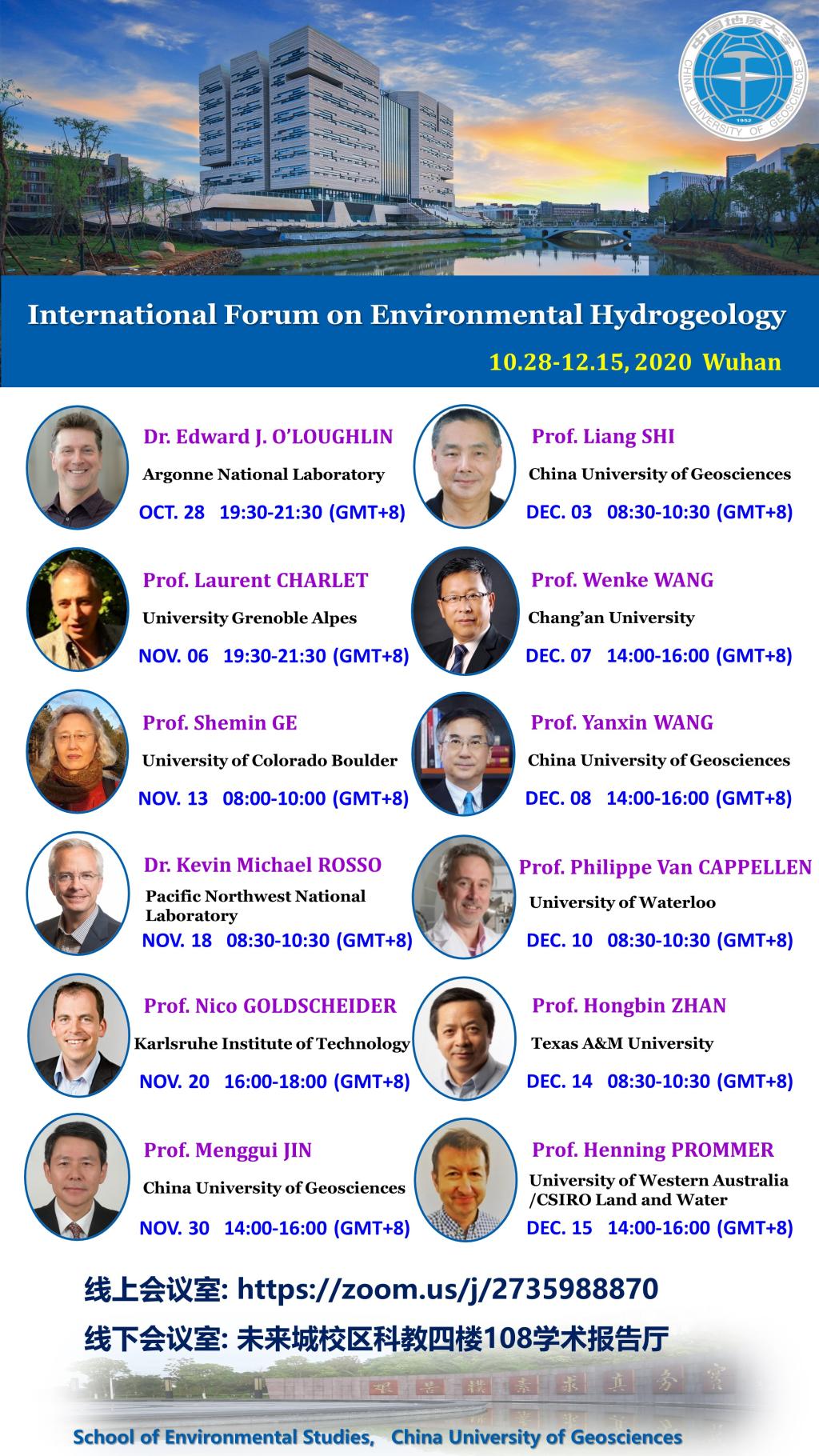 依托米兰“环境水文地质”国家自然科学基金委创新群体及“111计划”高等学校学科创新引智基地,米兰milan官方网站(武汉)环境学院于2020年10月28日-12月15日主办国际环境水文地质论坛。本论坛面向国家战略需求和国际学术前沿,围绕地下水污染与环境修复的前沿重大科学问题,邀请国内外12位知名学者交流学术进展和科研成果,旨在发挥水文地质学核心学科作用,实现水文地质、生态水文、水文地球化学、地质微生物等多学科理论与方法的交叉融合,加强国际学术交流与合作,推动我国地下水学科及相关领域的发展。