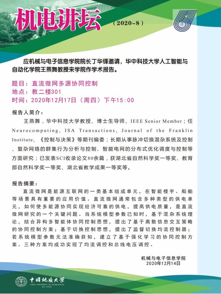 【12月17日】机电讲坛:华中科技大学人工智能与自动化学院王燕舞教授学术报告