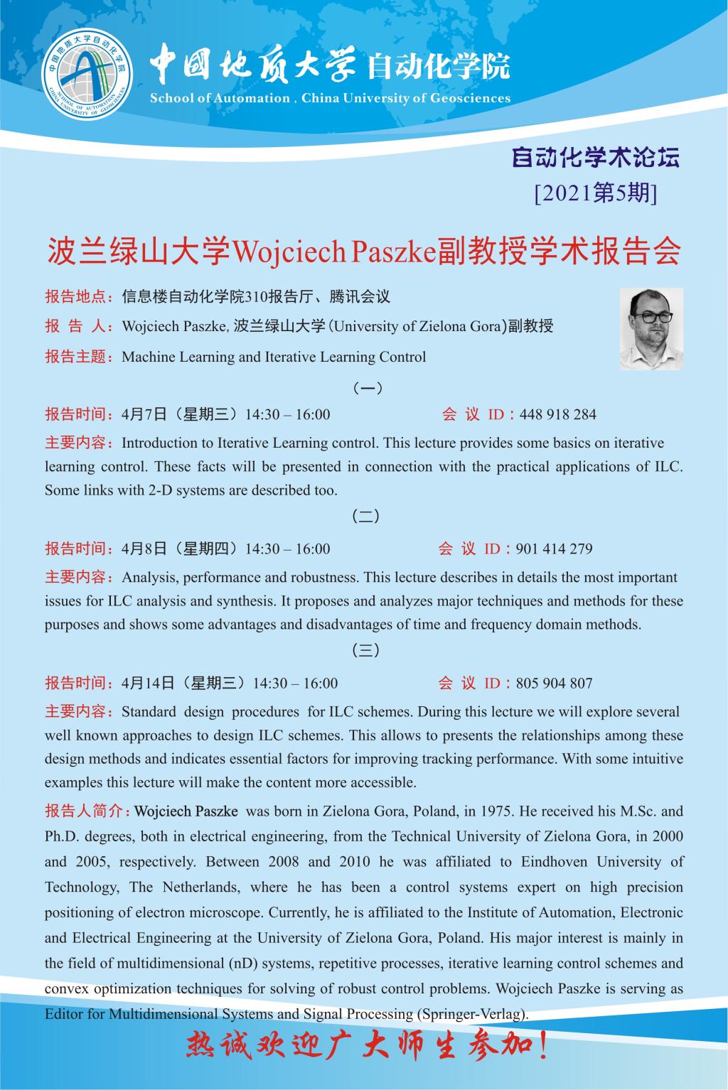 【4月7-14日】自动化学术论坛:波兰绿山大学Wojciech Paszke副教授学术报告