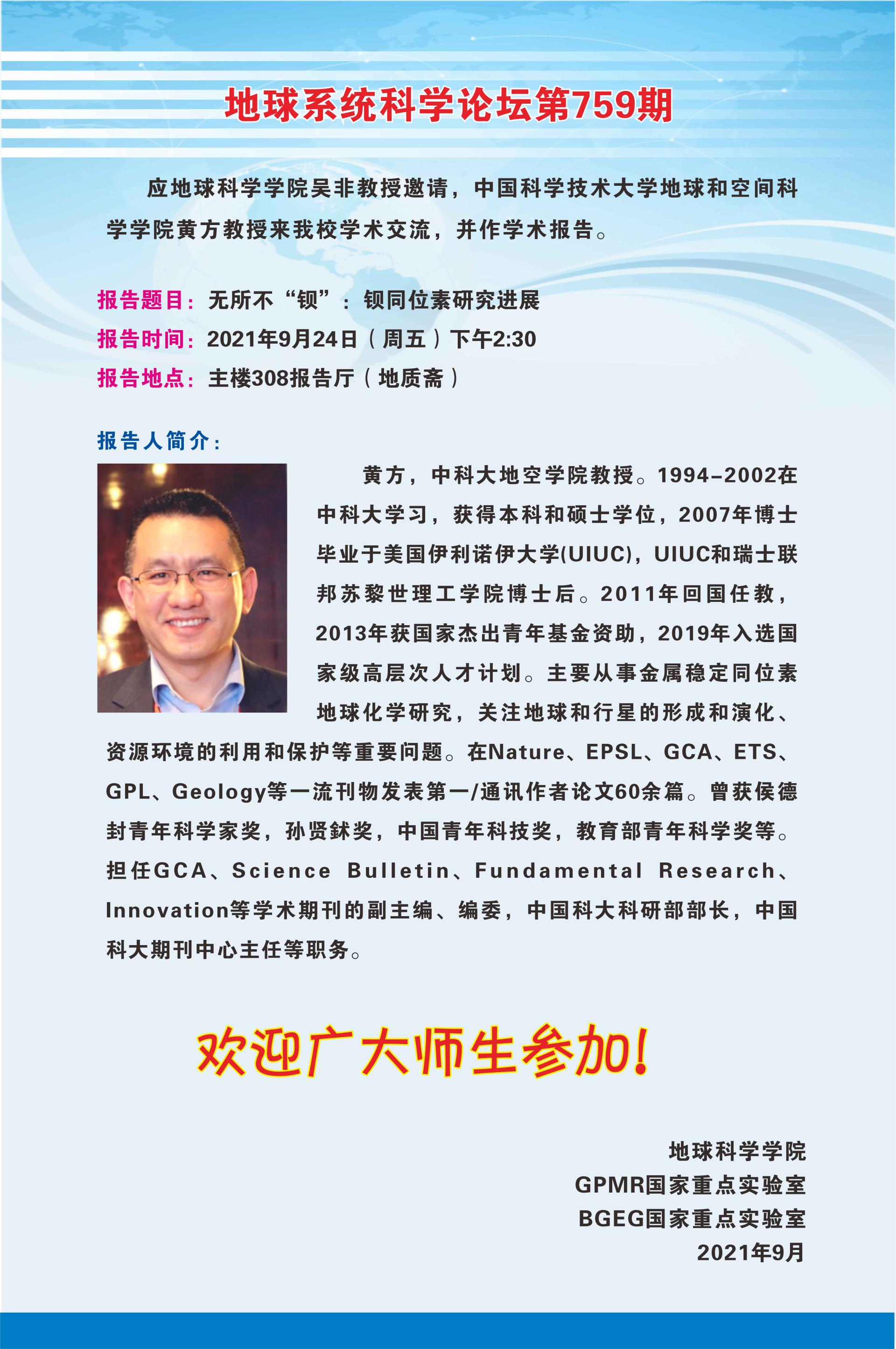 【9月24日】地球系统科学论坛:中国科学技术大学地球和空间科学学院黄方教授学术报告