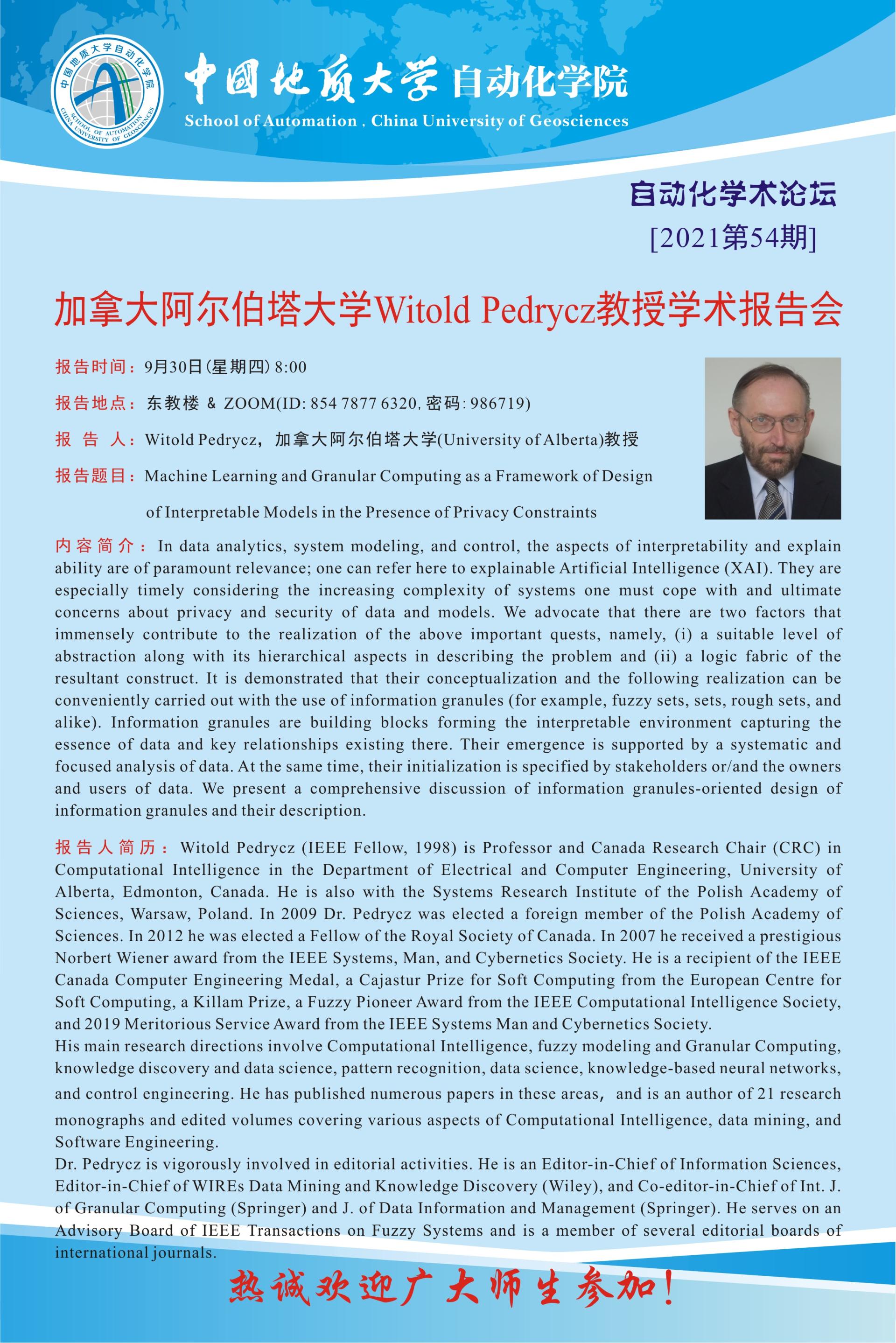 【9月30日】自动化学术论坛:加拿大阿尔伯塔大学Witold Pedrycz教授学术报告
