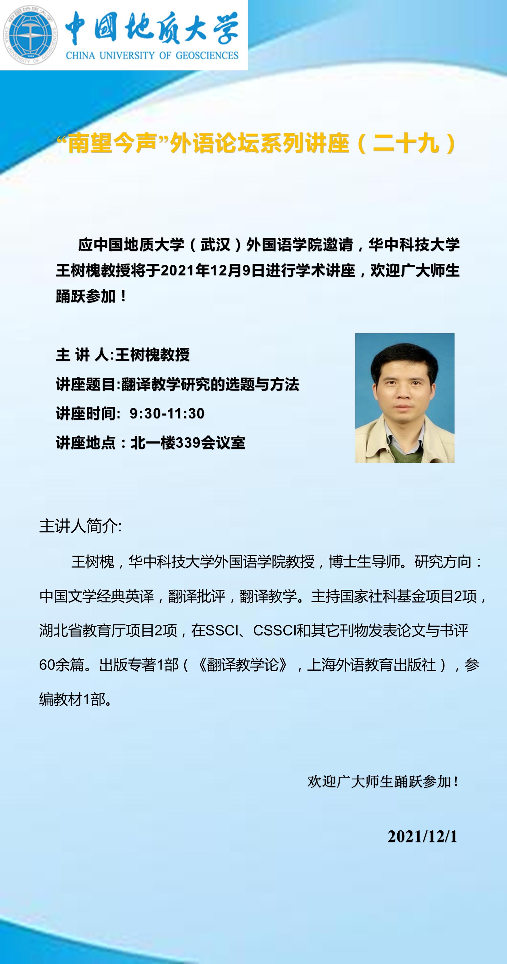 【12月9日】“南望今声”外语系列讲座:华中科技大学王树槐教授学术报告