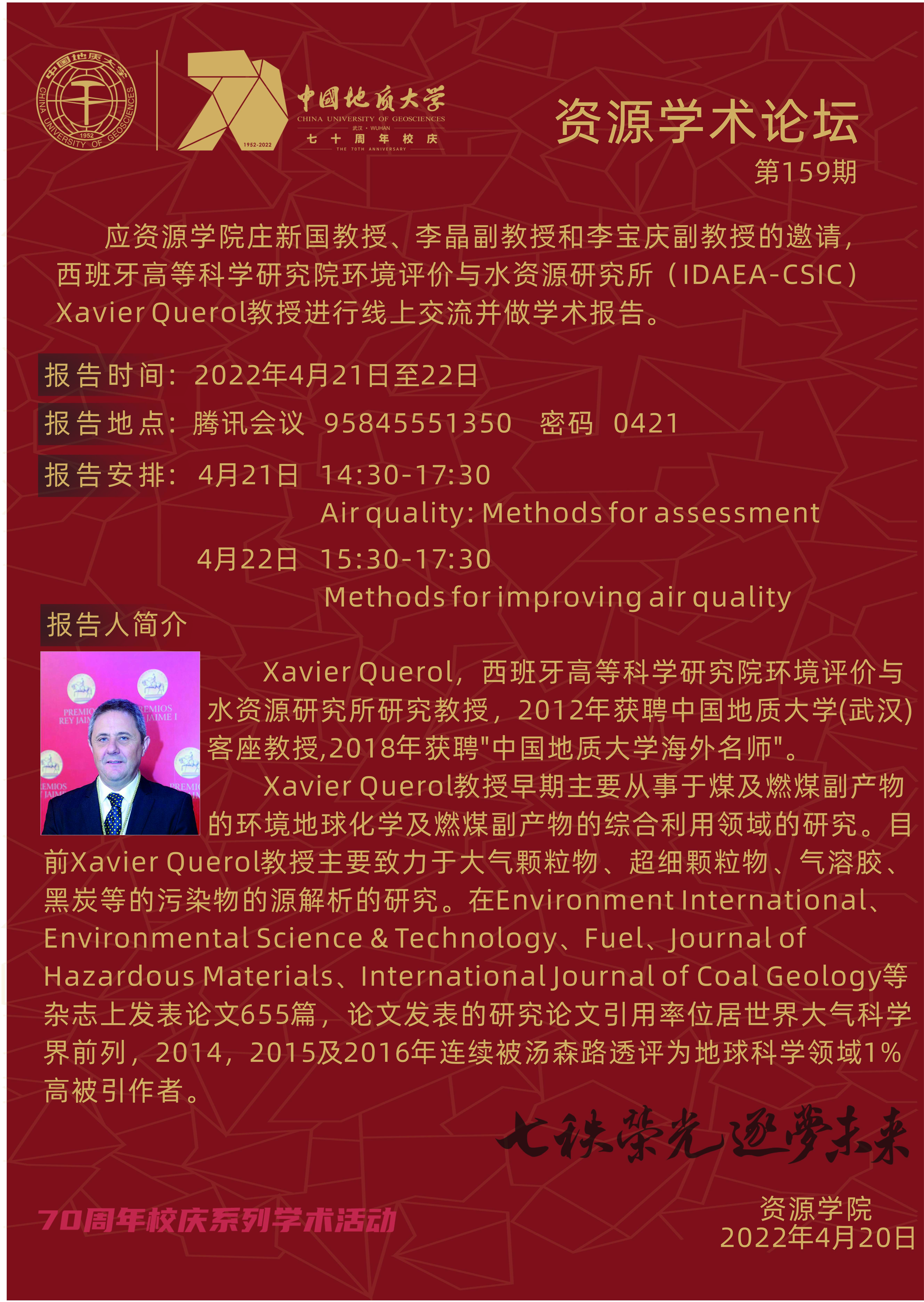 【4月21-22日】资源学术论坛:西班牙高等科学研究院环境评价与水资源研究所研究教授Xavier Querol学术报告
