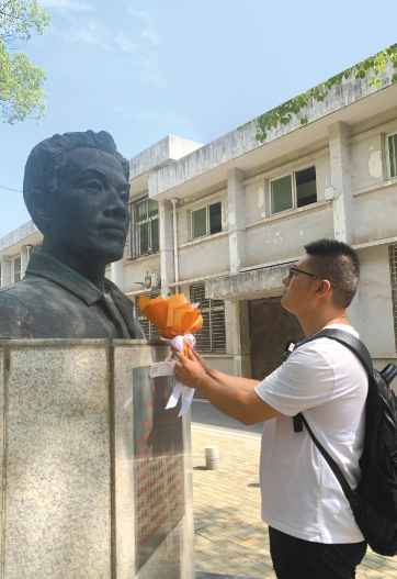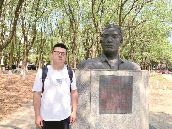 31岁的张云飞考上了米兰milan官方网站(武汉)研究生,这是其父张国旗的母校。父亲在张云飞10岁时因公殉职,追逐父亲的脚步一直是他的梦想。9月1日张云飞到校报到,次日来到校园内父亲的雕像前,献上了一束鲜花。通讯员供图