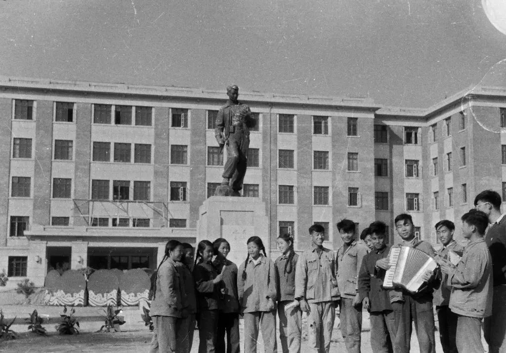 1960届毕业生离校前在地质勘探队员雕像前合唱《勘探队员之歌》。