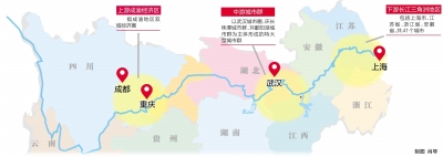 长江经济带,以长江黄金水道为依托,发挥上海、武汉、重庆的核心作用。长江经济带宛如一条巨龙,下游的上海是“龙头”,中游的武汉是“龙腰”,上游的重庆是“龙尾”。这三座城市背后分别对应长三角城市群、长江中游城市群和成渝城市群。