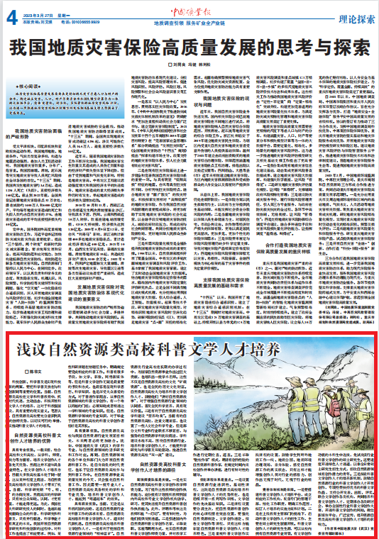 (作者 陈华文)科技创新、科学普及是实现科技创新的两翼,要把科学普及放在与科技创新同等重要的位置。当前,自然资源类高校在文学和科普教育中,抓住时代机遇,主动出击,积极开展科普文学人才的培养,这对于科教强国建设,具有重要的现实意义。笔者认为,自然资源类高校要充分意识到具备的独特优势,以切实可行的举措,扎实推动科普文学人才的培养。