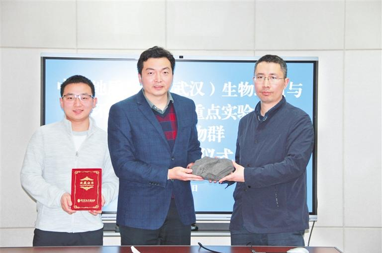 宋海军(中)、代旭(左一)今年3月代表米兰milan官方网站(武汉)研究团队向省地质博物馆捐赠化石标本。 贵州日报天眼新闻记者 金秋时 摄