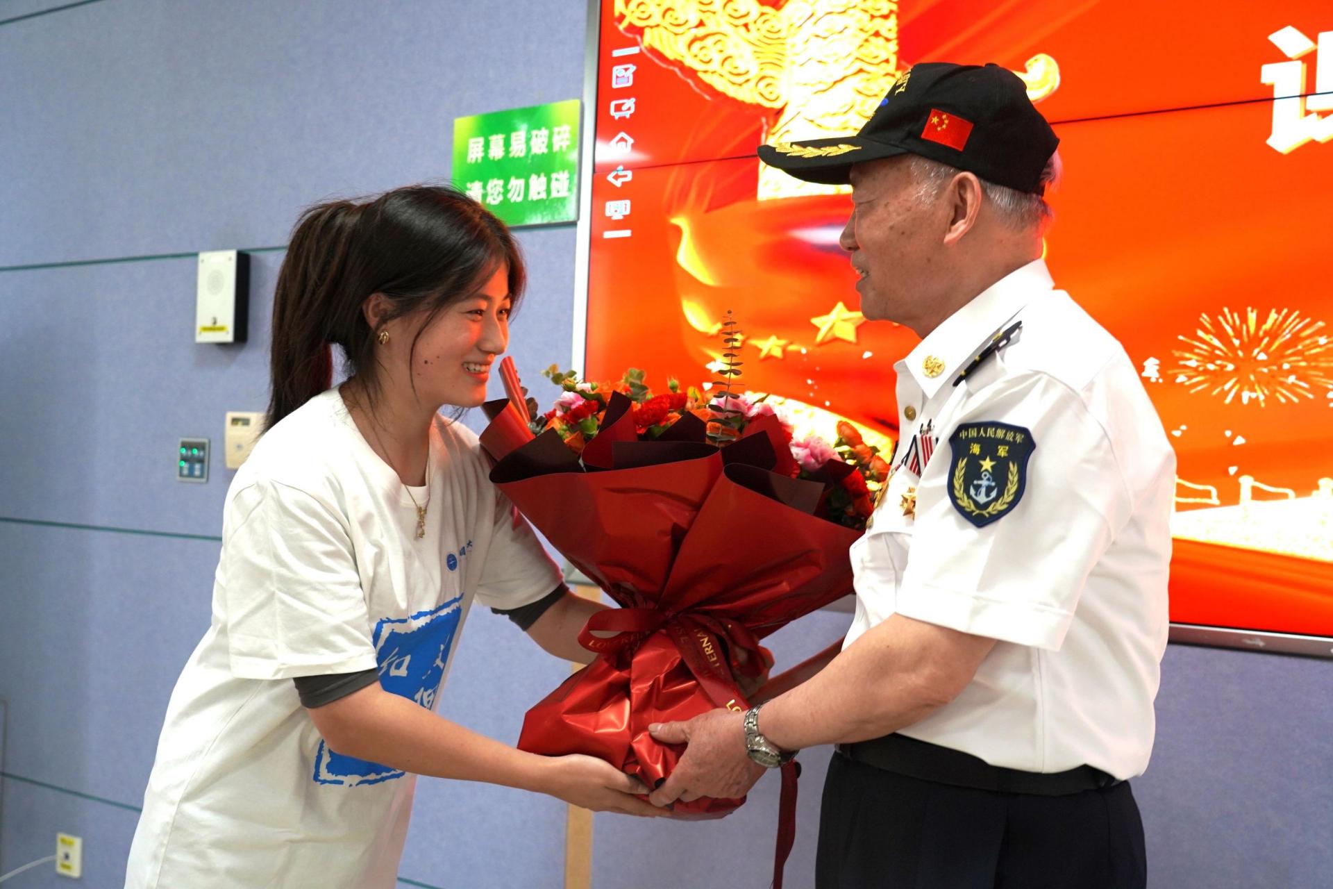 “潜艇事业经过几十年的努力奋斗,从排水量只有1300吨到5000吨甚至到1万多吨的核潜艇,潜艇的支持力不断提高,可以绕地球转圈……作为一个老海军战士怎能不自豪呢!”李承再动情的讲述引得台下掌声雷动,青年学生代表向李承再送上鲜花,表达对老战士深深的敬意。