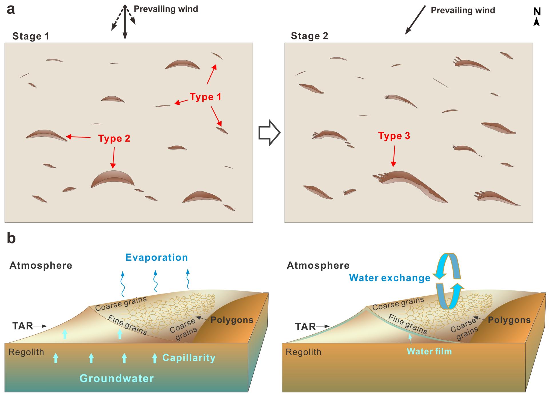 “祝融号”着陆区横向风成脊的演化模式及表面多边形裂隙可能的形成机制。课题组供图