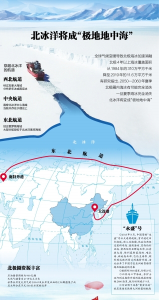 东北航道又称为北方海航道,大部分航段位于俄罗斯北部沿海的北冰洋离岸海域。2013年8月,中国货轮“永盛”号从大连港起航,首次通过白令海峡,进入北极圈,然后向西经过楚科奇海、德朗海峡、东西伯利亚海、新西伯利亚群岛北部、拉普捷夫海、维利基斯基海峡、喀拉海、新地岛北部、巴伦支海等,顺利到达欧洲荷兰的鹿特丹港,由此拉开了中国乃至亚洲的货船穿越北极航道的序幕。