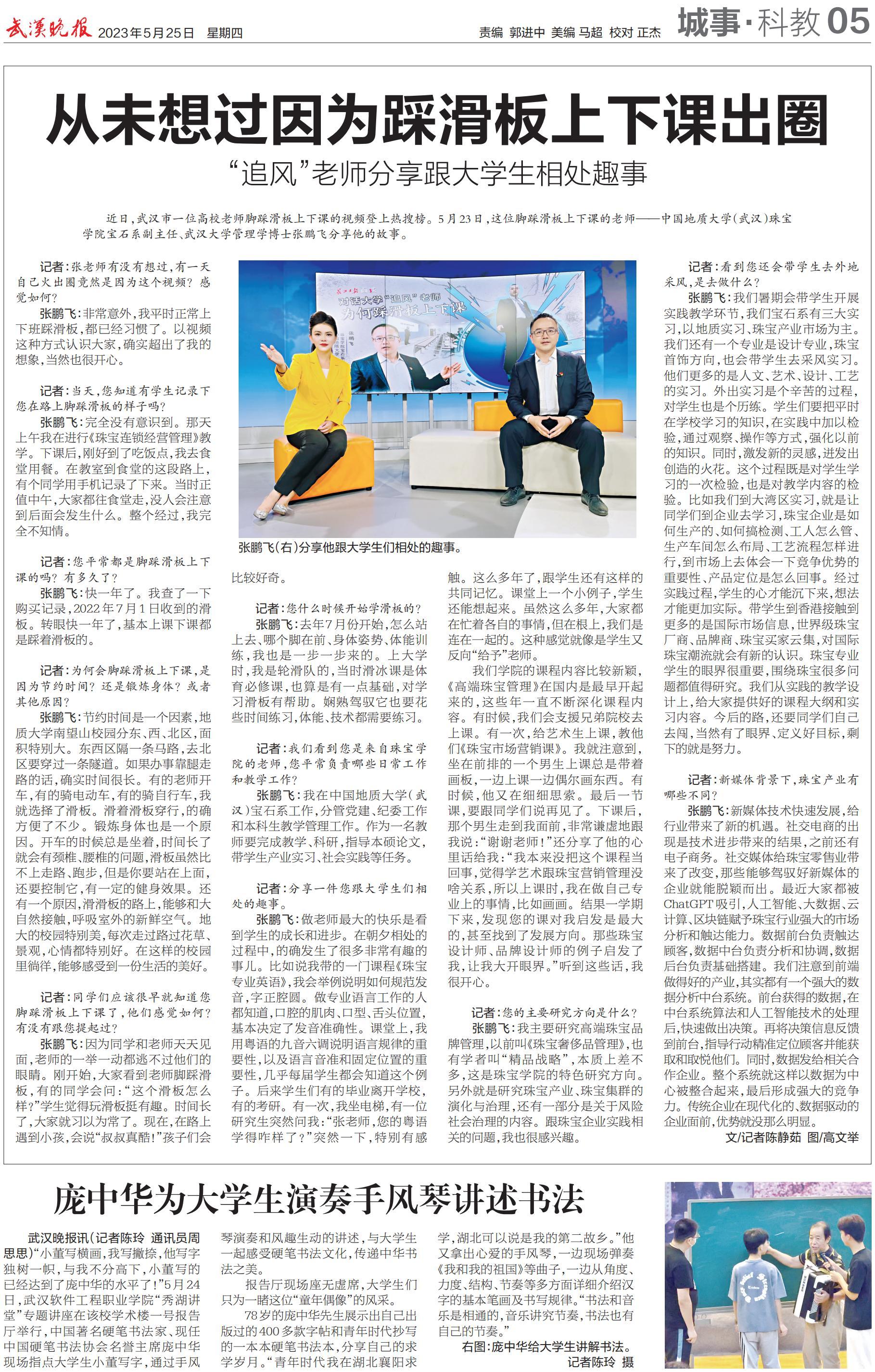 近日,武汉市一位高校老师脚踩滑板上下课的视频登上热搜榜。5月23日,这位脚踩滑板上下课的老师——米兰milan官方网站(武汉)珠宝学院宝石系副主任、武汉大学管理学博士张鹏飞分享他的故事。