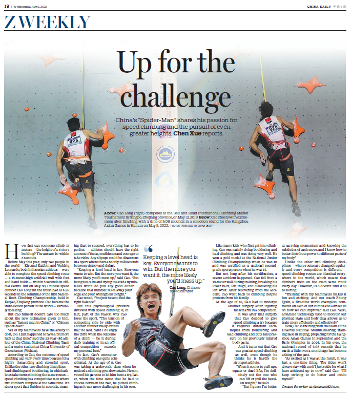 Before May this year, only two people in the world — Kiromal Katibin and Veddriq Leonardo, both Indonesian athletes — were able to complete the speed climbing route — a 15-meter-high artificial wall with foot and hand holds — within 5 seconds in official events. But on May 30, Chinese speed climber Cao Long hit the finish pad at 4.98 seconds in the semifinal of the first National Rock Climbing Championship, held in Keqiao, Zhejiang province. Cao became the third-fastest person in the world — vertically speaking.