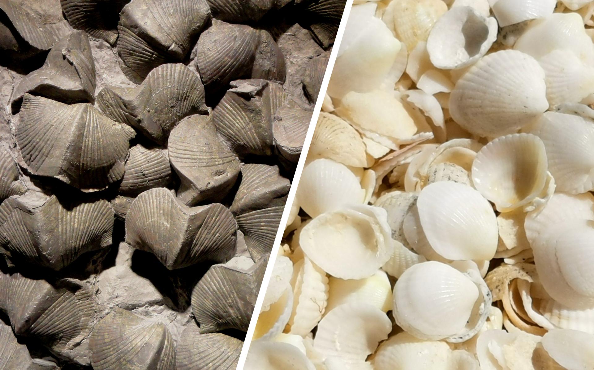 左图:美国泥盆纪腕足类化石。图片源自Daderot(Wikimedia Commons)。右图:西澳大利亚贝壳滩(shell beach)的现代双壳类,陈中强/摄