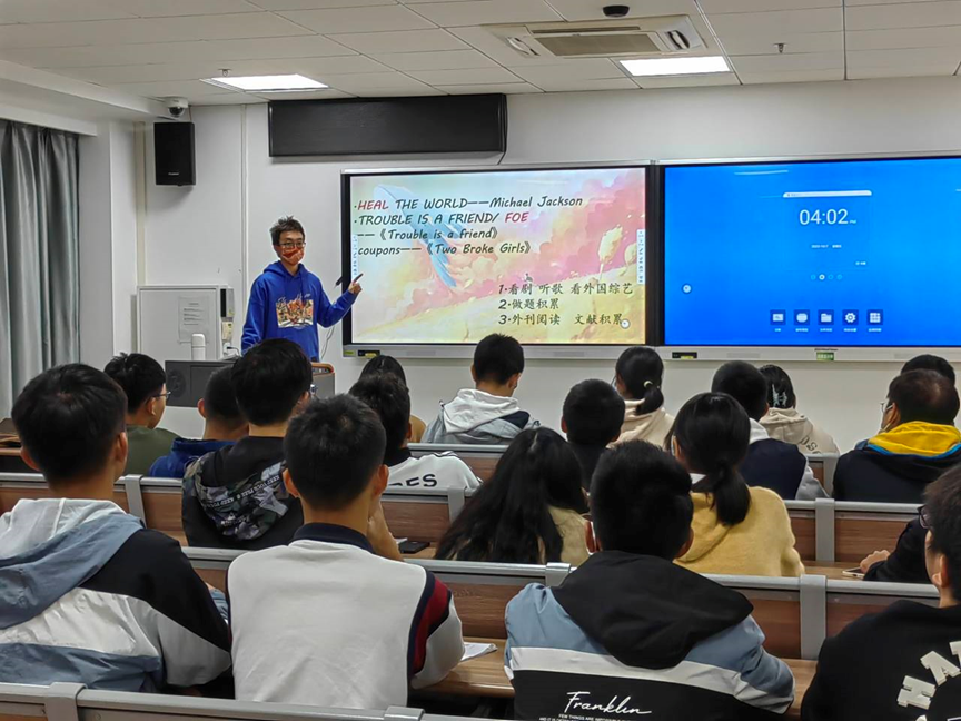 图为陈宇琪同学与低年级同学分享英语学习经验