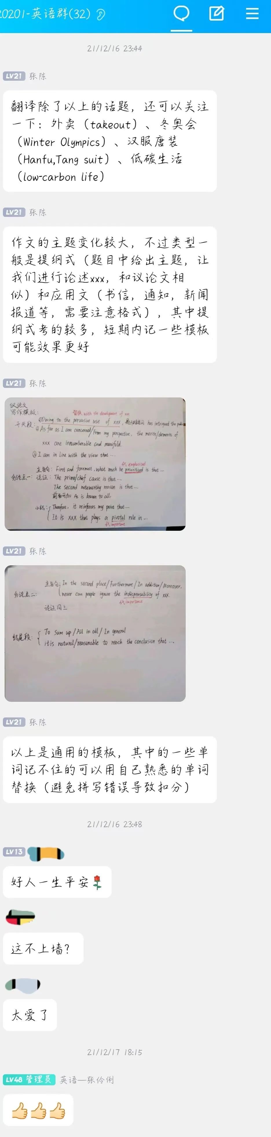 图为张陈同学的四六级考试群分享复习笔记